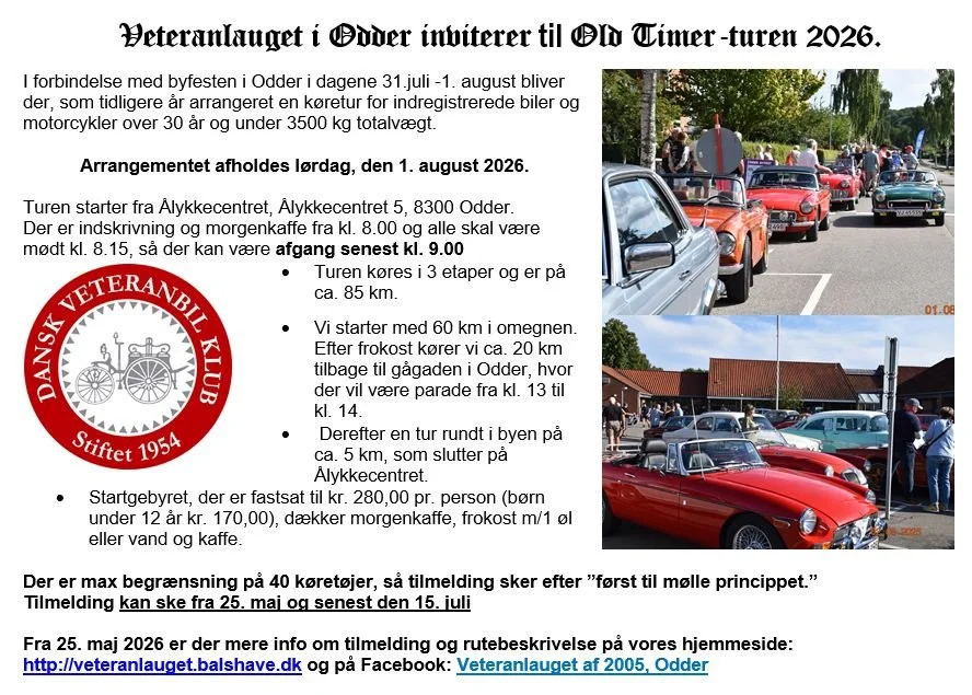 Old Timer Turen lørdag den 1. august 2026 08.00 16.00 Ålykkecentret Ålykkecentret 5 8300 Odder Denmark (kort) Google kalender ICS